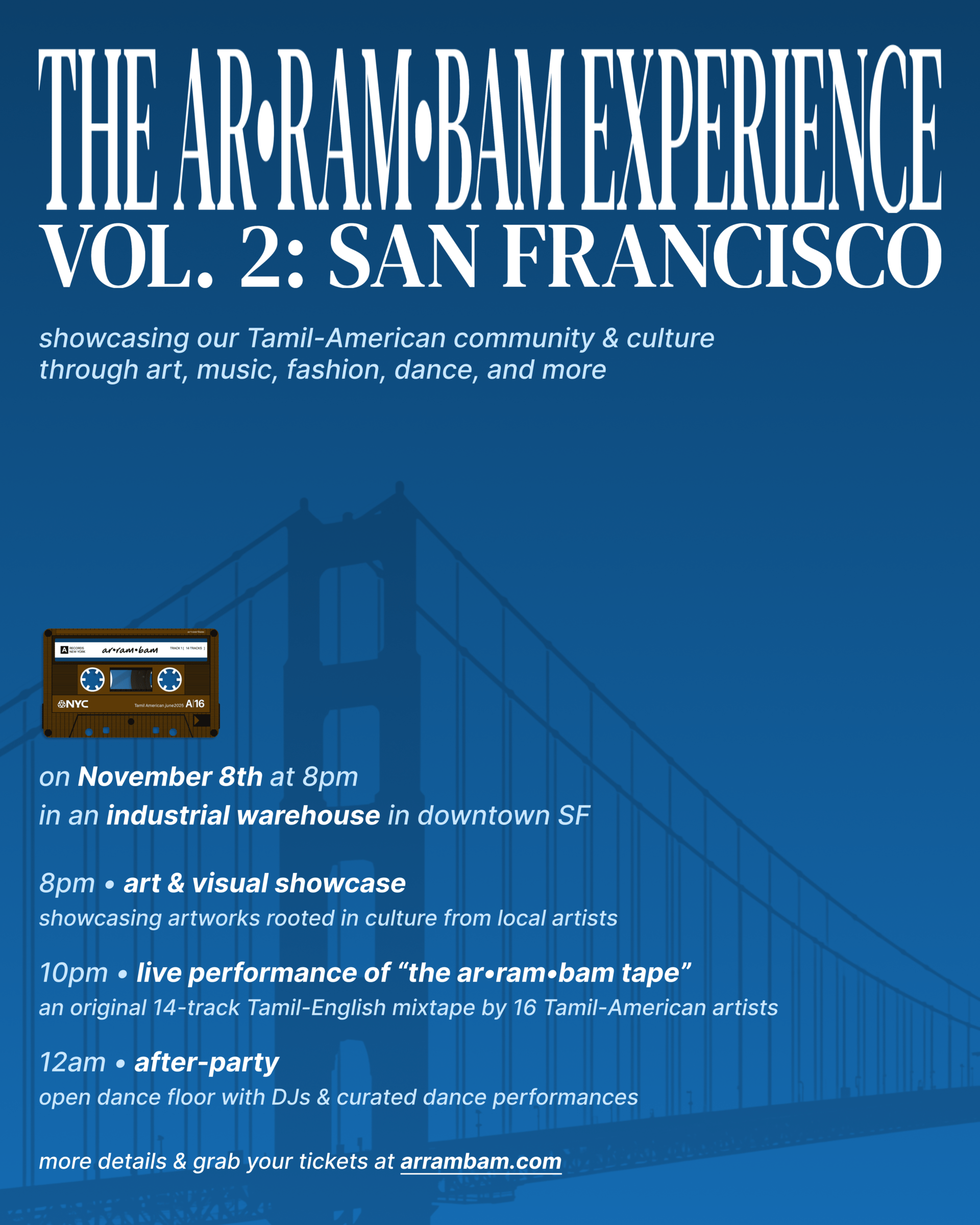 weāve had the opportunity and privilege to host different types of experiences in SF before ā Tamil meetups, dance workshops, even comedy shows ā but we want arā¢ramā¢bam experience: volume two to be something completely new.